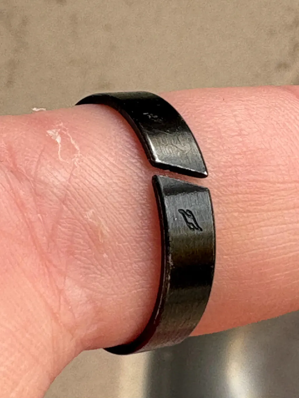 Hand wearing a black ring on a neutral background